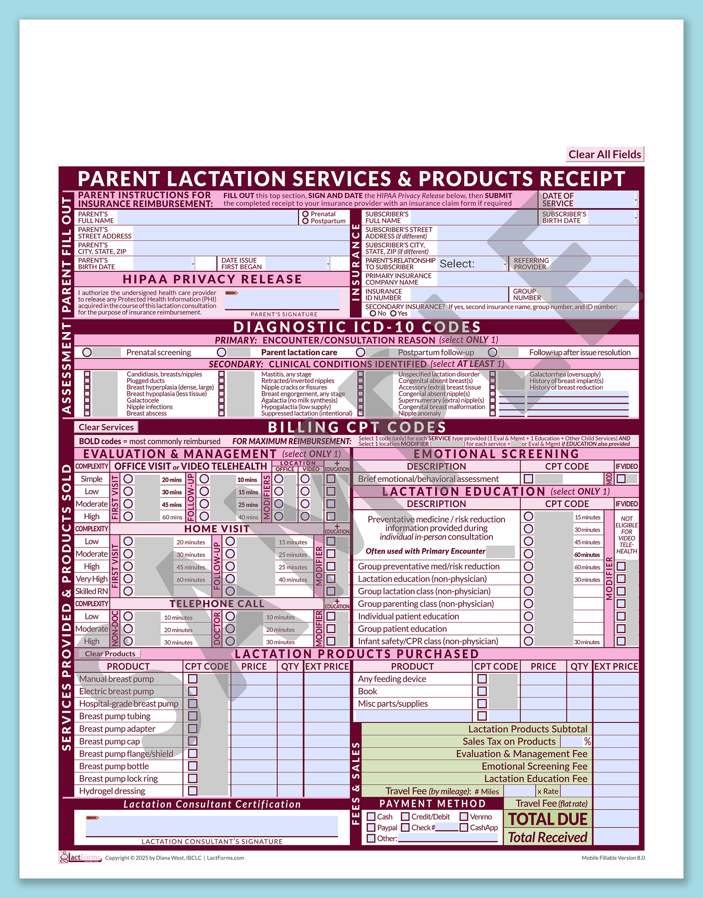 LactForms parent superbill is a comprehensive lactation-specific receipt in PDF format that guides you through the completion process with logical flow and clear directions for maximum reimbursement and client satisfaction. This version has been significantly redesigned with more diagnostic and billing codes (including video telehealth and telephone call visits), streamlined flow, and comprehensive instructions.